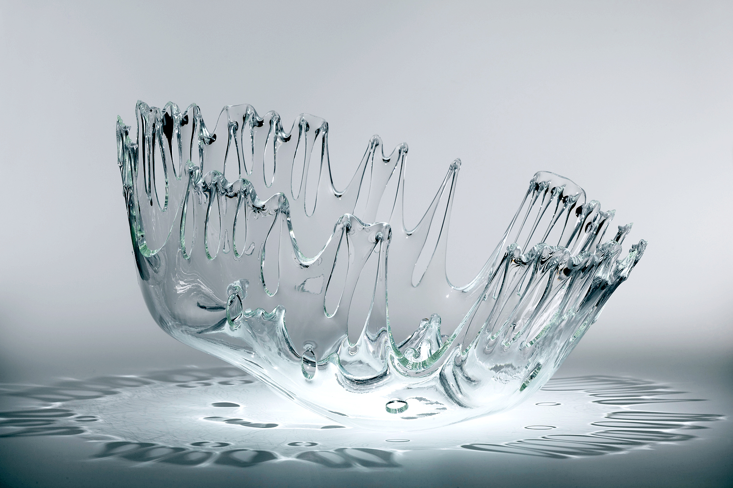 Glas ist nicht fest, nicht flüssig, aber in Bewegung. Eine Materialeigenschaft, die mich dazu motiviert hat, dieses Medium zu verwenden. Mit einem gezielten Brenn- und Abkühlvorgang lasse ich das Material für kurze Zeit flüssig werden, erhalte diesen Moment und friere ihn ein. Die so entstehenden Glasgefäße materialisieren den dynamischen Prozess im Ofen. Sie dehnen und strecken ihre glänzende Haut öffnen sich dem umgebenden Raum und umschreiben ein Volumen.