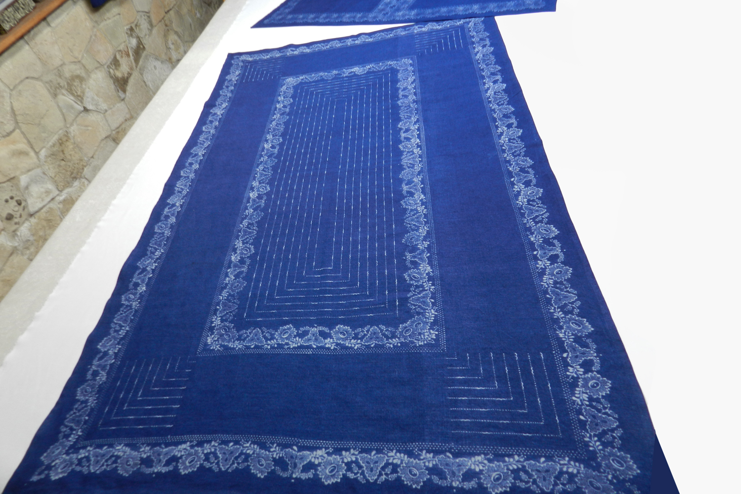 Die Technik ähnelt der Batik. Mit Hilfe von Modeln wird eine Abdeckmasse (Papp) auf 100% Naturstoffen wie Leinen, Baumwolle u. Nessel aufgetragen. Nach ca. 6 Wochen wird dann in der Küpe der Stoff mit Indigo blau gefärbt. Beim Nachbehandeln wird bewusst auf Säuren verzichtet.