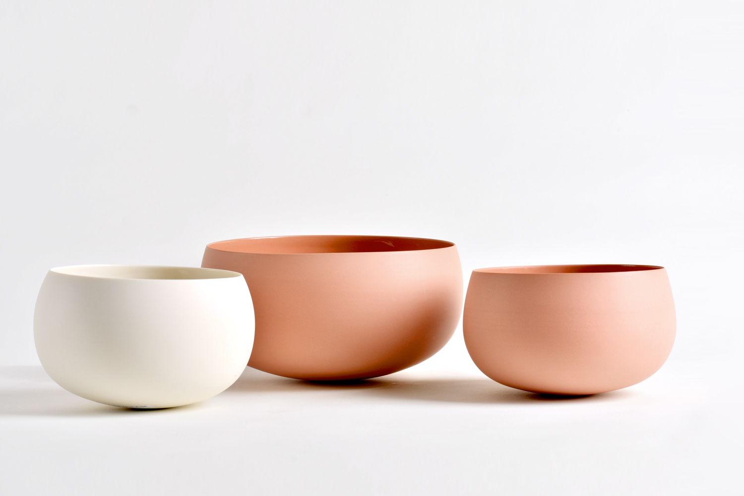 Bei meinen Schwingschalen aus weißem und durchgefärbtem Porzellan steht die Idee einer ausgewogenen harmonischen Form, ihre ästhetische Qualität und Gleichgewicht im Vordergrund. Die Wölbungslinie der Form zieht sich durch das ganze Gefäß und gibt den Ausdruck von Leichtigkeit und Schweben. Die Gefäße balancieren auf einem Punkt. Farbe und Form sollen auf ideale Weise harmonieren. Die unglasierte, glatt geschliffene Außenseite ergibt eine optisch matte und haptisch angenehme Oberfläche. Die Innenseite ist transparent glasiert, dies ergibt einen angenehmen Kontrast zwischen glänzend und matt sowie eine unterschiedliche Farbwahrnehmung. Die Schwinggefäße werden frei gedreht.