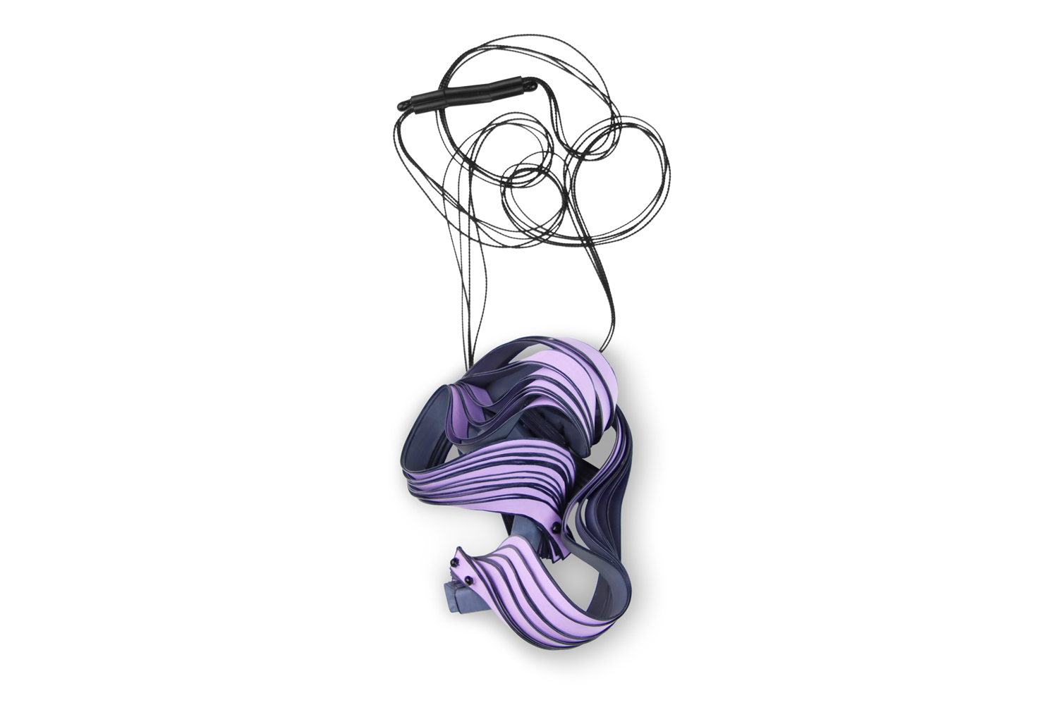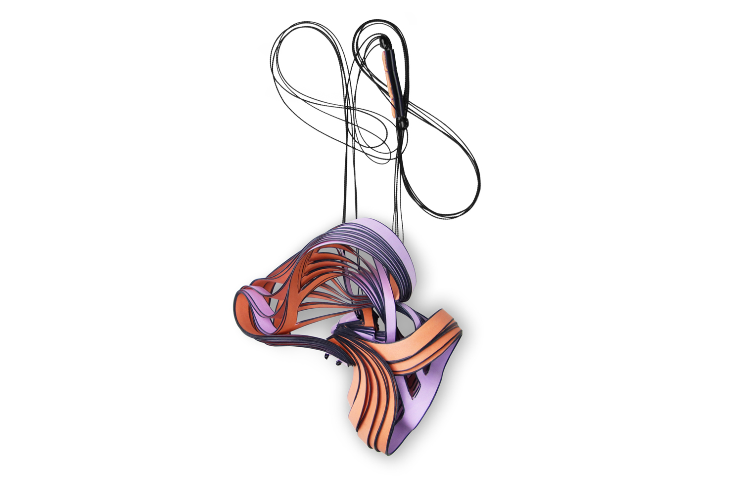 Ich schneide von Hand Formen aus Zeichenkarton. In der Form gleich, haben sie leicht unterschiedliche Längen. Bemalt mit selbstgemischten Kalligrafietuschen, lasiere ich sie und entferne im Ofen die Restfeuchte. Zu einem Bündel gefasst fixiere ich sie an einer Stelle. Ich beginne, in den Bündelenden Spannung aufzubauen und sie zu bewegen. Dabei taste ich mich vorsichtig heran, um zu entscheiden, wie ich die Enden platziere. Die Bewegung orientiert sich am Widerstand des Materials. Es reagiert auf die aufgebaute Spannung und die Bewegungen meiner Hand. Durch Festzurren mit Perlseide erfolgt die endgültige Fixierung. Abschlussarbeiten machen es als Schmuckstück tragbar.