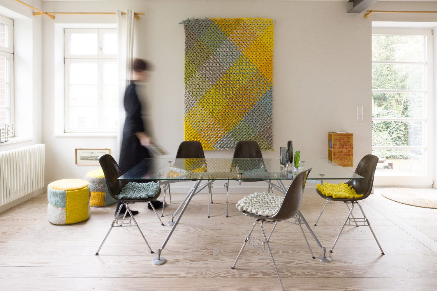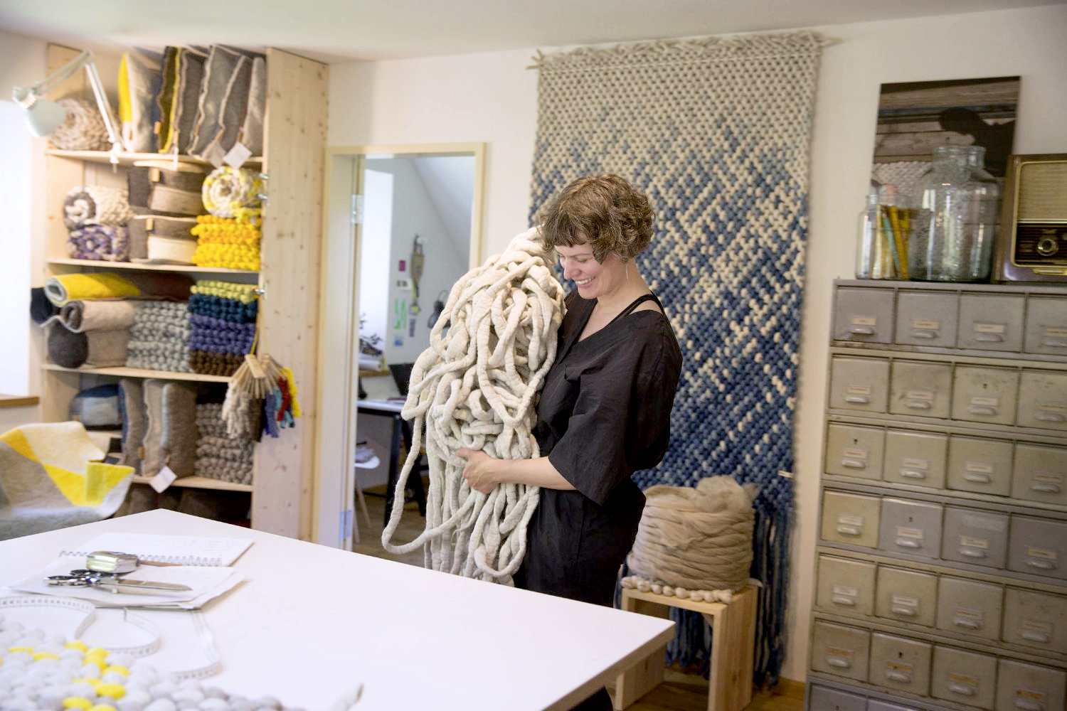 Die Textil Designerin Michelle Mohr entwirft und fertigt Teppichunikate für Wand und Boden im Niedersächsischen Wendland. Zu ihrer Produktserie zählen auch Sitzkissen, Kissen und Heimtextilien aus regionaler und deutscher Schafwolle. Das Design der Produkte bewegt sich im Spannungsfeld zwischen urbaner Sachlichkeit und der Sinnlichkeit des vielseitigen Rohstoffes Wolle. Naturfarbene Schafwolle kombiniert sie gezielt mit gefärbter Wolle.