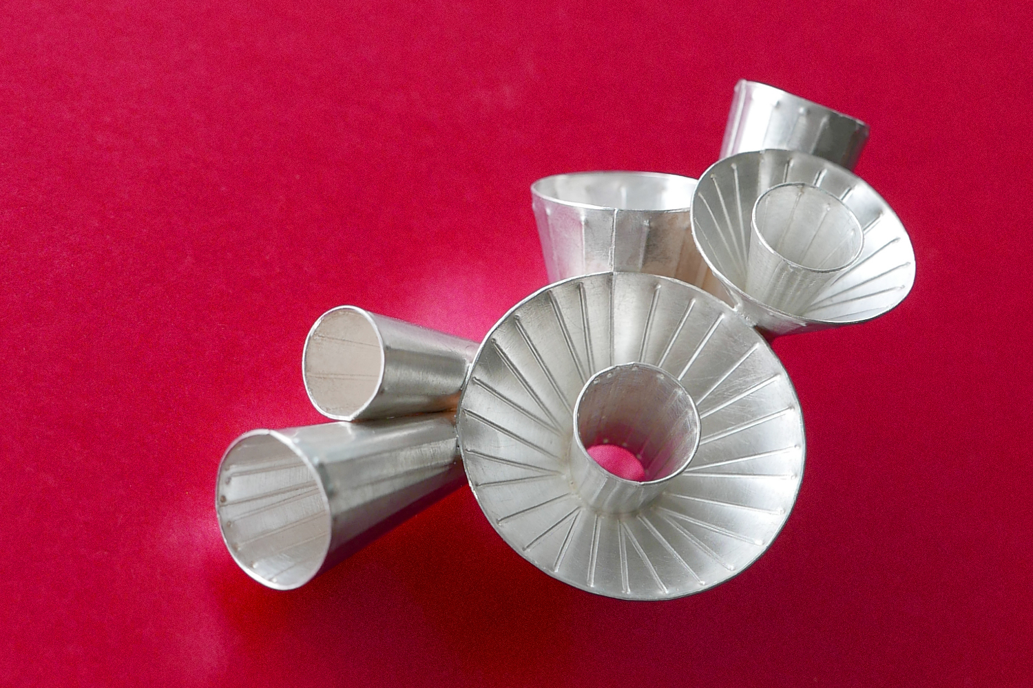 Eine besondere formgebende Technik entwickelte ich mit Lineal und Reißnadel: feine Silber-Zuschnitte rollen und wölben sich beim Falzen im durchdachten Strukturierungsprozess zu dreidimensionalen Objekten auf. Dabei erhalten sie gleichzeitig eine Ornamentierung. Und nebenbei wird das Material durch die Umformung stabilisiert. Überraschung: die Stücke sind auch bei großen Volumen sehr leicht und tragbar.
