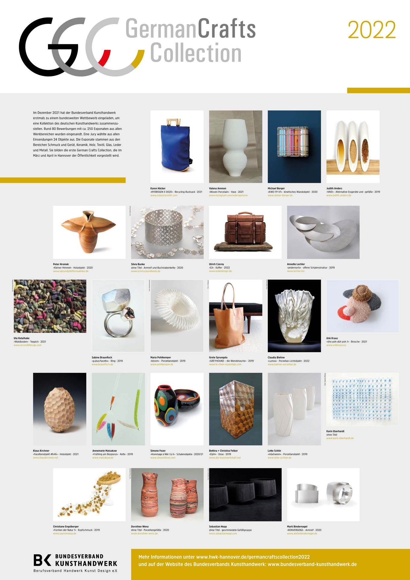 Im Dezember 2021 rief der Bundesverband Kunsthandwerk erstmals zu einem bundesweiten Wettbewerb auf, um eine exklusive Kollektion des deutschen Kunsthandwerks zusammenzustellen. Die Jury wählte 24 außergewöhnliche Werke aus den Bereichen Schmuck und Gerät, Keramik, Holz, Textil, Glas, Leder und Metall aus. Diese bilden die erste German Crafts Collection, die im März und April 2022 im Rahmen der Frühjahrsausstellung „Handmade in Europe“ in Hannover präsentiert wurde.