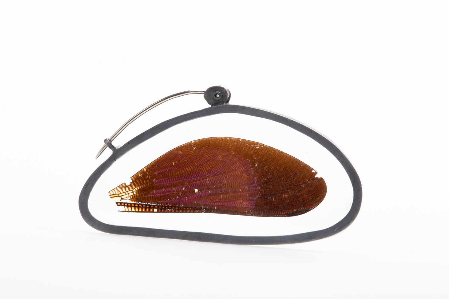 3.) Das Herzstück dieser Brosche ist ein Libellenflügel aus Indonesien. Die Farben verändern sich je